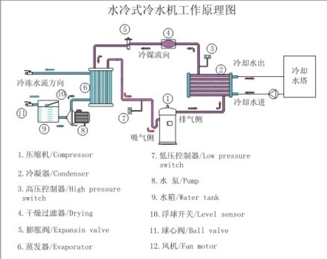 水冷式冷水機(jī),運(yùn)行更為平穩(wěn),冷量損失少,易回油,傳熱管不易發(fā)生凍裂,比風(fēng)冷機(jī)能效高。但水冷機(jī)占地廣,且在價(jià)格上要比風(fēng)冷高一些。在選擇冷水機(jī)時(shí)一定考慮客觀環(huán)境因素,選擇合適的類型。
